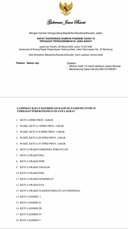 Usulan Komisi V dan saya dalam rapat tsb meminta agar “GUBERNUR JAWA BARAT SEGERA MENGAMBIL LANGKAH LANGKAH UNTUK PENANGANAN SECARA EFEKTIVE DAN PROFESIONAL” tandas kang Dadang Supriatna yang akrab dipanggil kang DS anggota Komisi V, Fraksi Golkar DPRD Provinsi Jawa Barat di ruangan pribadinya, 26/3/2020.