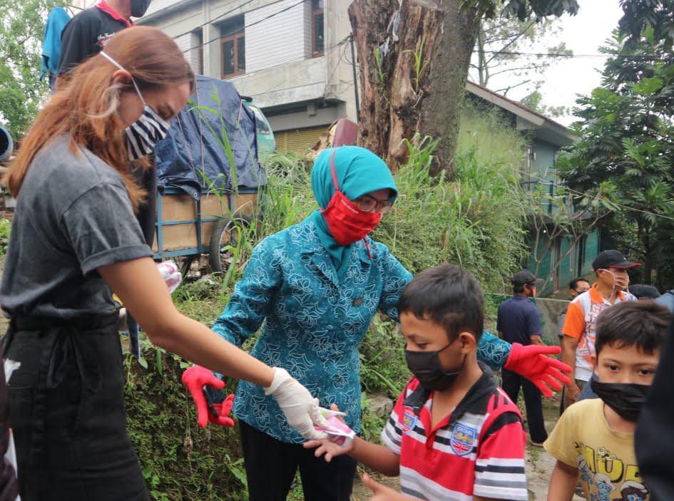 Pada kesempatan tersebut Lucyani ditemani putrinya Diva Zahra Priatna membagikan susu kota kepada anak-anak warga yang terimbas Covid 19.